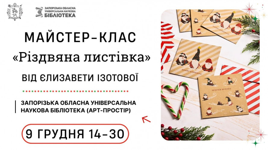 - 9 грудня о 14.30 - майстер-клас "Різдвяна листівка" від запорізької художниці Єлизавети Ізотової. Із собою необхідно взяти фарбу (гуаш або акварель). Безкоштовно.
