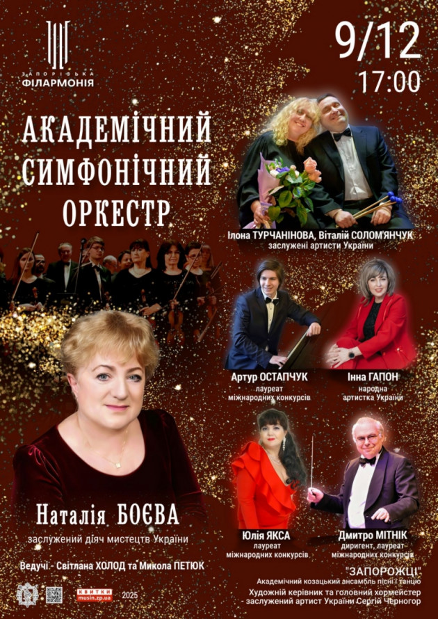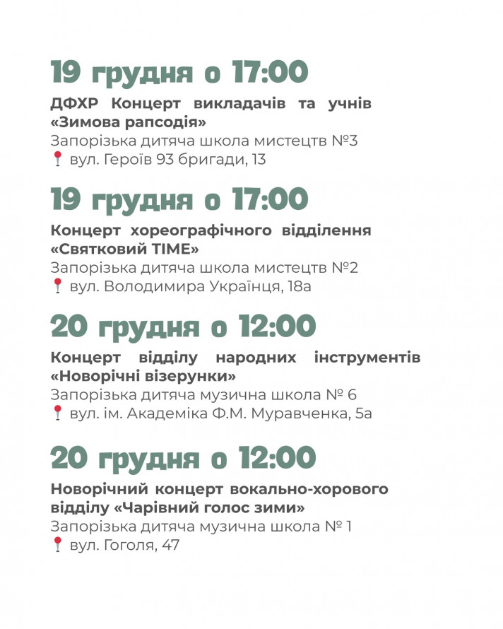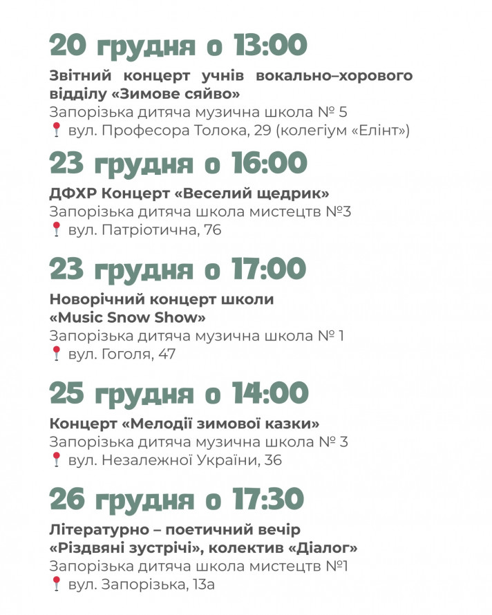 - 9 грудня о 17.00 – у звʼязку з погіршенням безпекової ситуації 29 листопада концерт академічного симфонічного оркестру під орудою диригента Дмитра Мітніка перенесено на 9 грудня. У програмі: твори запорізької композиторки, заслуженої діячки мистецтв України та членкині Національної спілки композиторів України Наталії Боєвої. Усі придбані на 29 листопада квитки залишаються дійсними.