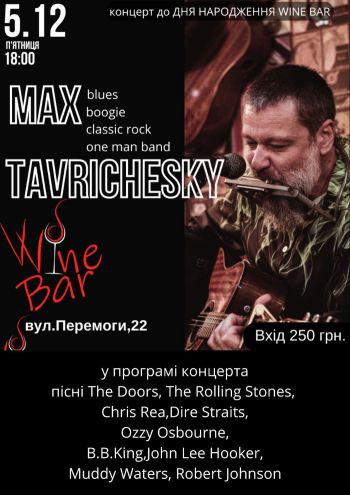 - 5 грудня о 18.00 - концерт людини-"оркестра" Макса Таврійського (Херсон) до дня народження WineBar.