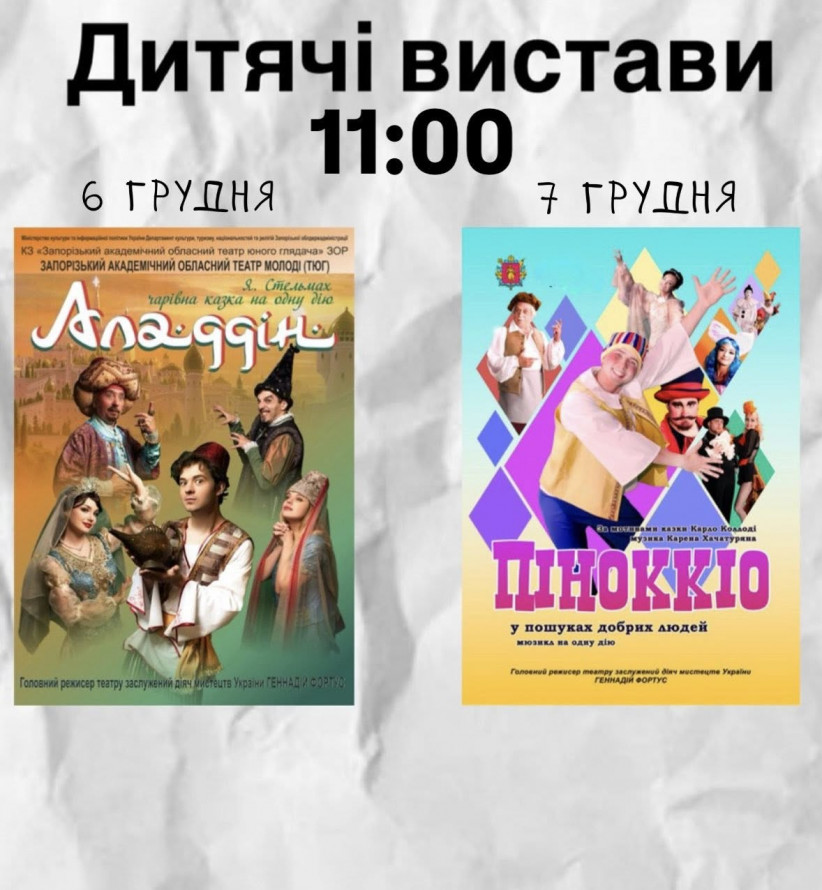 - 6 грудня об 11.00 - інтермедія до Дня святого Миколая та показ чарівної музичної казки "Аладдін".