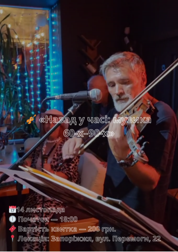 - 14 листопада о 18.00 - авторській вечір "Назад у часі: музика 60-х–90-х" Валерія Степанова (скрипка & вокал).
