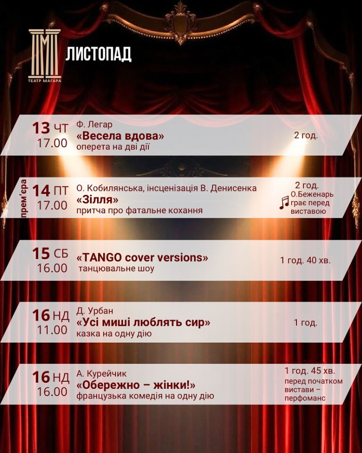 - 13 листопада о 17.00 - оперета "Весела вдова".