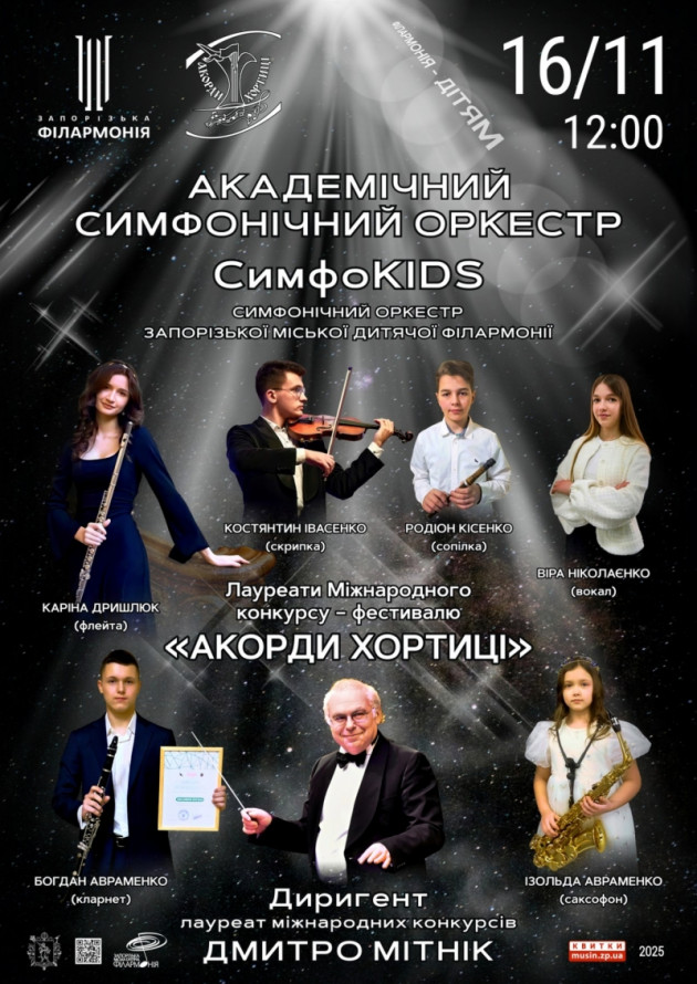- 16 листопада 12.00 - концерт "Академічний симфонічний оркестр. "СимфоKIDS". Лауреати Міжнародного конкурсу-фестивалю "Акорди Хортиці".