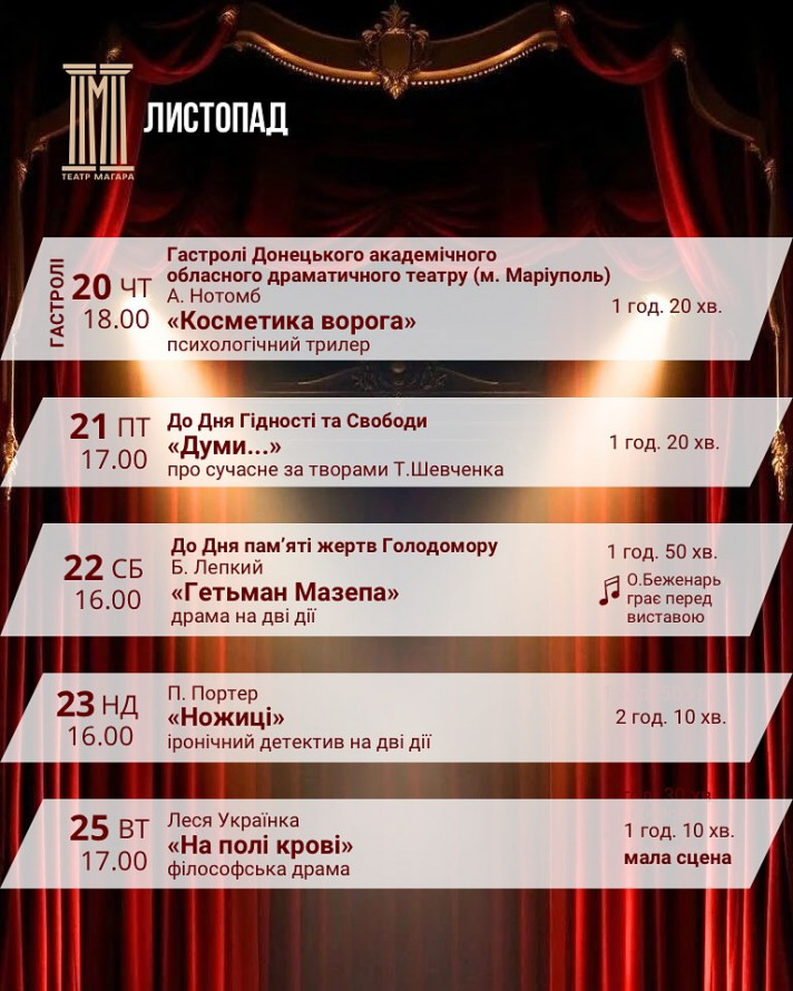 - 20 листопада о 18.00 - прем'єра психологічного трилеру "Косметика ворога" за твором сучасної письменниці Амелі Нотомб від Донецького обласного драматичного театру (Маріуполь).