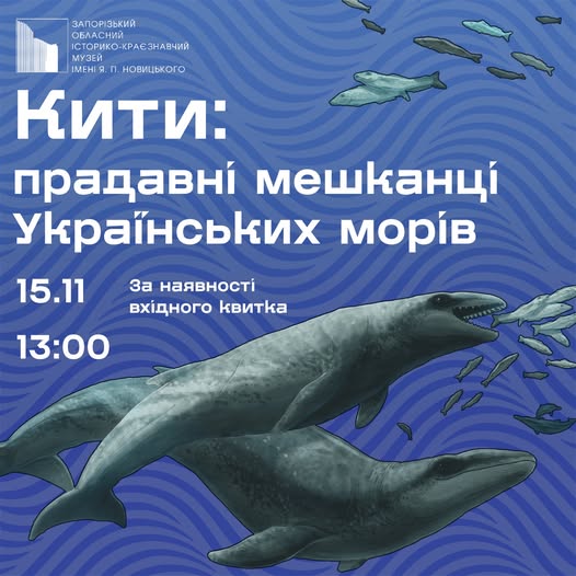 15 листопада о 13.00 - лекція "Кити: прадавні мешканці українських морів". Для відвідування лекції необхідно тільки придбати вхідний квиток у музей. Квиток - 50 грн, пільговий - 25 грн.