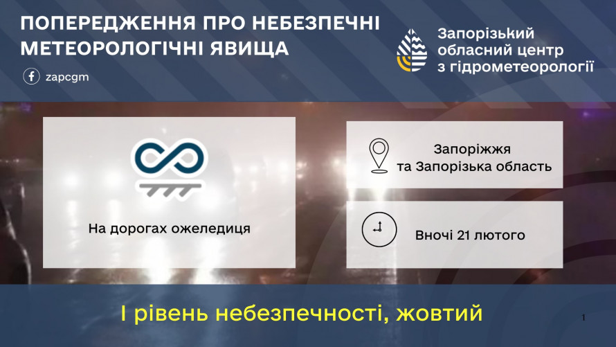 Вночі 21 лютого на дорогах очікується ожеледиця (І рівень небезпечності, жовтий).