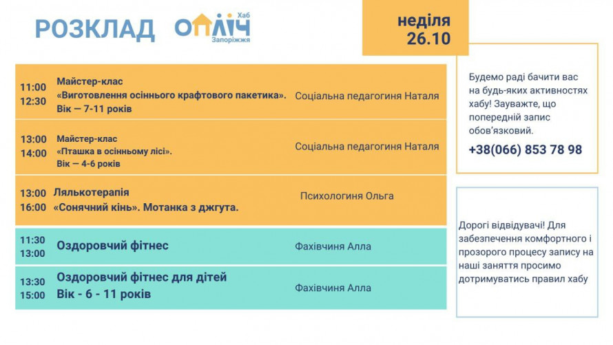 «У нас є телеграм-канал, де щоп’ятниці виставляють розклад. Необхідно лише написати у Telegram або Viber ваше прізвище і назву активності. З вами зв’яжуться. Це абсолютно безкоштовно для всіх бажаючих — для місцевих жителів, гостей міста, ВПО, для будь-яких вікових категорій та верств населення», — додає вона.