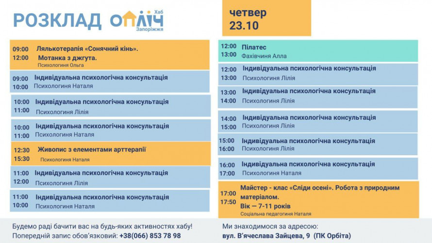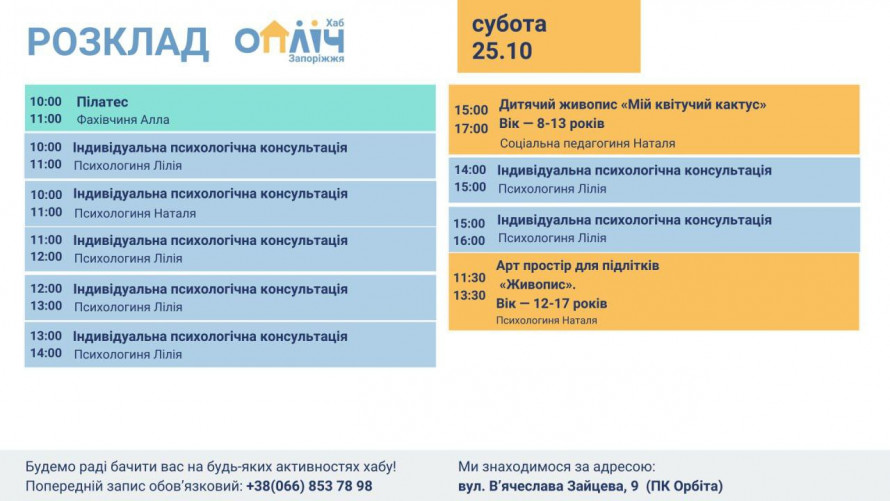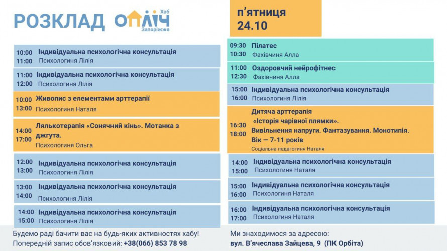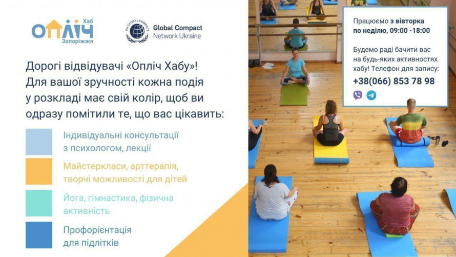 У Запоріжжі вже понад два роки працює «Опліч Хаб» — простір, де діти та дорослі можуть отримати підтримку та безкоштовно відвідувати індивідуальні психологічні консультації, арт-терапію, майстер-класи для дорослих та дітей, заняття з йоги та оздоровчого фітнесу.
