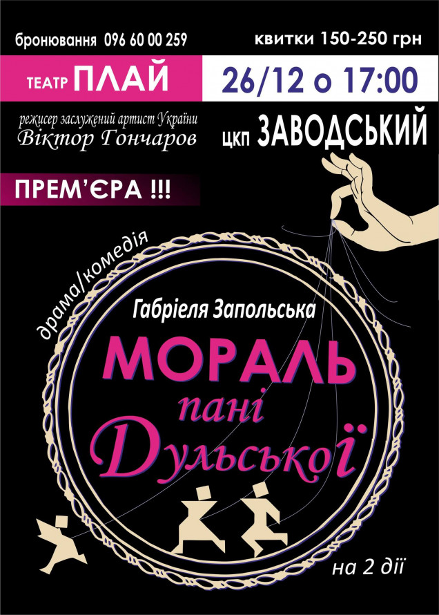 - 26 грудня о 17.00 - трагікомедія "Мораль пані Дульської", у ЦКП "Заводський".