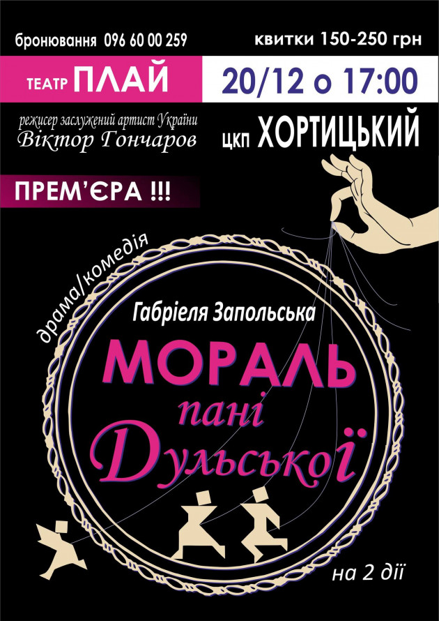 - 20 грудня о 17.00 - прем'єра трагікомедії "Мораль пані Дульської", у ЦКП “Хортицький” (просп. Преображенського, 15).
